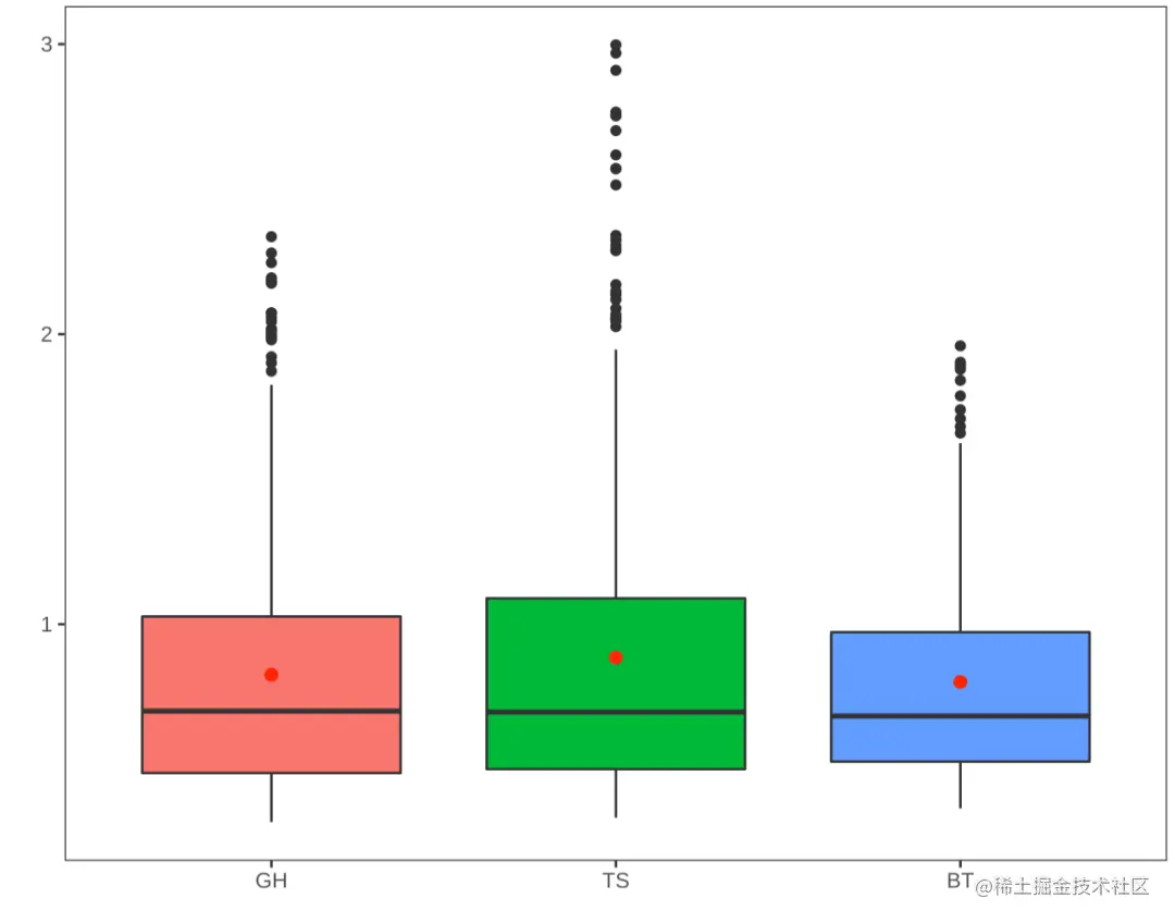 stat_summary(fun.y=mean, na.rm=T, geom="point", shape=21, size=2, fill="red",color="red") +