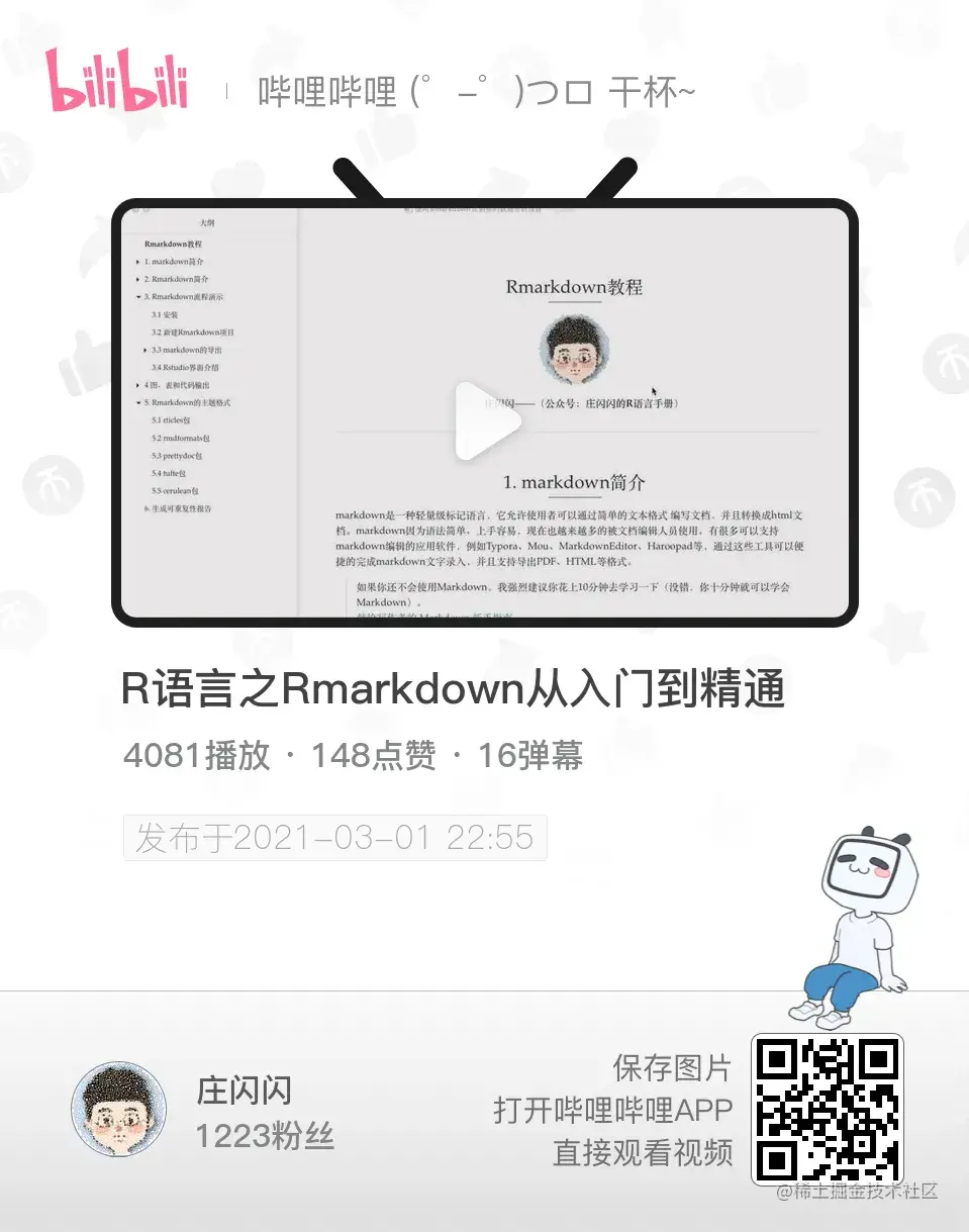 推荐: 可以保存以下照片,在b站扫该二维码,或者b站搜索【庄闪闪】观看Rmarkdown系列的视频教程。Rmarkdown视频新增两节视频(写轮眼幻灯片制作)需要视频内的文档,可在公众号回复【rmarkdown】