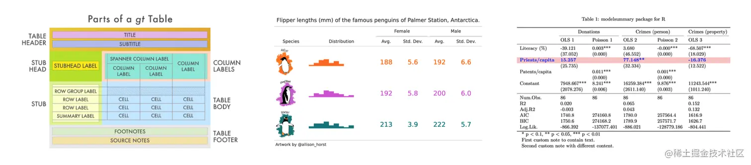 - gt使用R编程语言创建漂亮的表。gt的理念:用一组内聚的表部件构建各种各样的有用的表。这包括表头、存根、列标签和扳手列标签(spanner column labels)、表主体和表页脚。