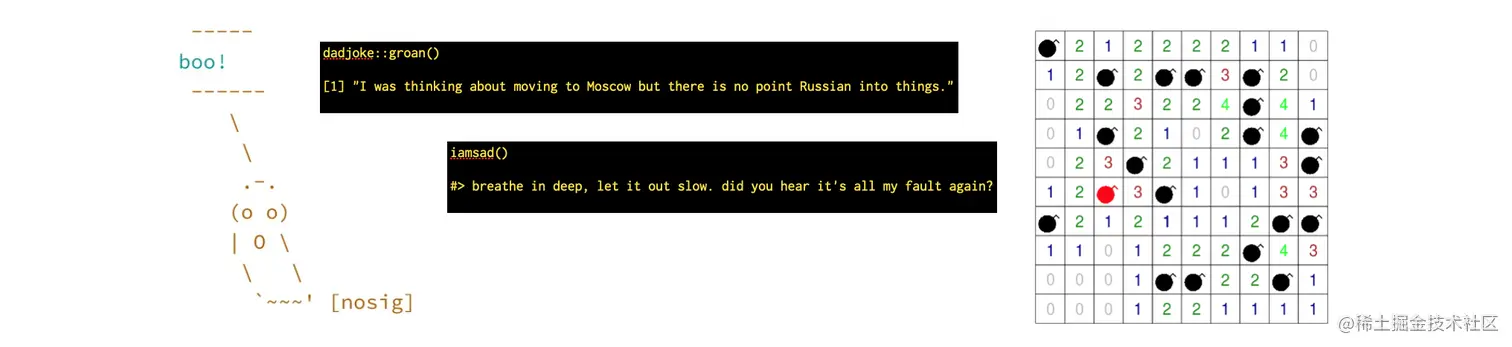 - cowsay创建一条伴随着ASCII动物艺术的消息,可从CRAN获得。