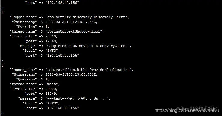 在linux中查看logstash日志就可以看到有了我们输出的日志信息,但是linux我没有配置中文展示所以乱码,但是并不影响: