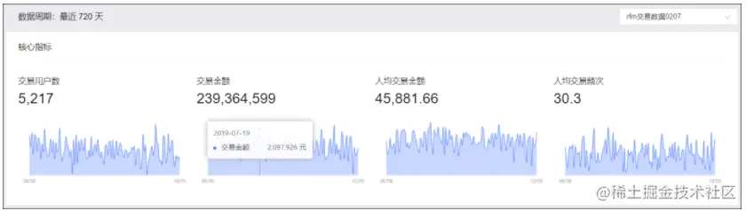 展示交易用户数、交易金额、人均交易金额、人均交易频次的具体数值及趋势图。在Quick Audience中RFM分析界面效果如下: