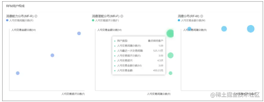 消费潜能分布(MR-F):横坐标为R最近一次交易间隔,纵坐标为M交易金额,点大小为F交易频率。通过MR分布来直观看到客户的消费潜能情况,进而通过F的大小来挖掘更有价值的客户。点越大,客户越有挖掘价值。