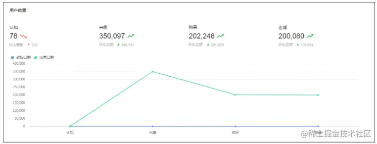 展示认知、兴趣、购买、忠诚四类用户在日期区间结束时的用户数以及环比差额。如在如在Quick Audience中AIPL流转界面效果: