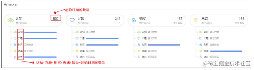 起始日期的认知人数等于仍保持为认知的人数,加上认知的用户转化量(即从认知转化为兴趣、忠诚、购买的人数),再加上认知流失的人数之和。