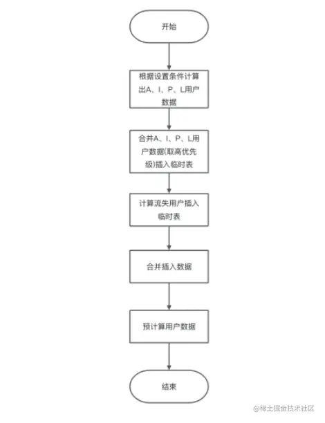解决方案:在每天计算完A、I、P、L的用户只保持增量数据,如第一天有500w的数据,第二天有501w的数据,其中2w的新增和1w的流失,再原来数据的基础上只有3w数据量的变更。