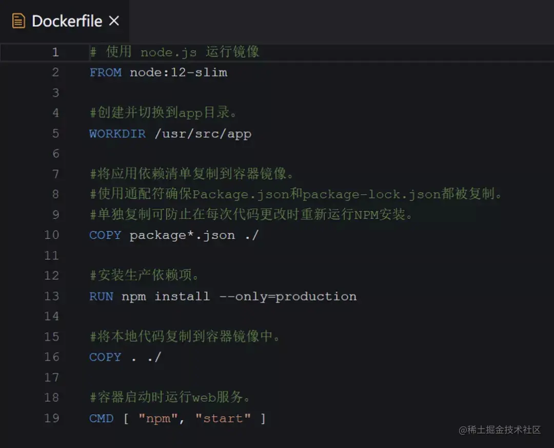 比如,上图中引入了 Node 的基础镜像,这个镜像拥有我们运行 Node.js 程序所需的资源。