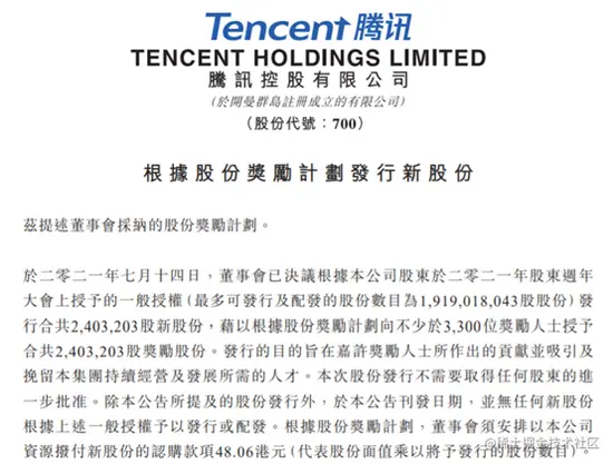 7月15日,腾讯控股发布公告称,为嘉许奖励部分员工作出的贡献,并吸引及挽留本集团持续经营及发展所需的人才,董事会已决议向不少于3300位奖励人士授予合共2,403,203股奖励股份。