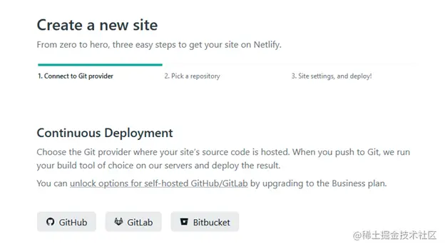使用Netlify对任何开发者来说都是一种独特的体验。它几乎不需要任何指导。只需点击几下,你就可以连接你的GitHub、GitLab或BitBucket仓库,并一次性配置CI/CD和托管。