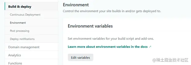 你可以通过浏览网站设置>构建和部署>环境>环境变量来编辑网站设置环境变量。