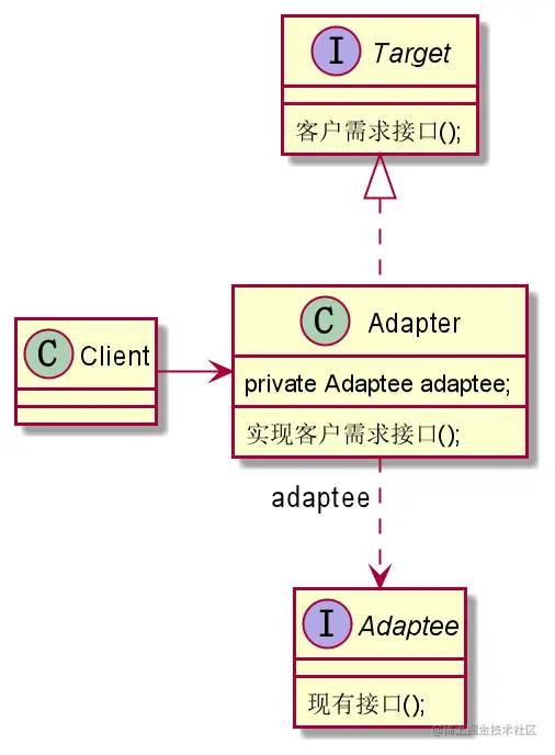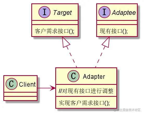 不管采用何种方式,其基本的实现思想都是:对现有接口的实现类进行扩展,使其实现客户期望的目标接口。