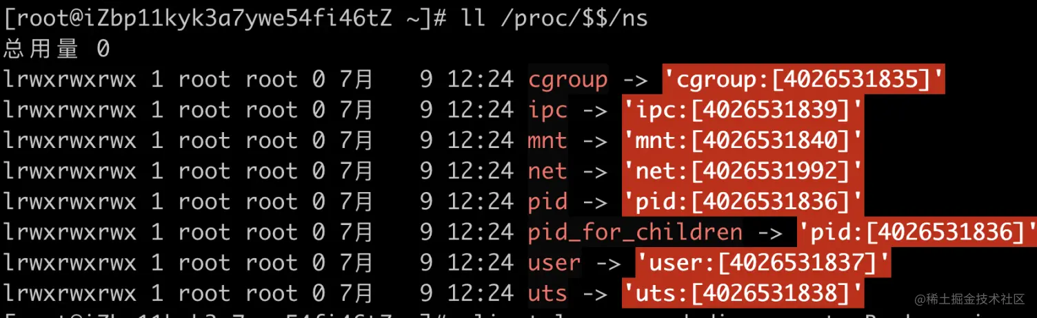 这些 Namespace 文件都是链接文件。链接文件的内容的格式为 xxx:[inode number]。其中的 xxx 为 Namespace 的类型,inode number 则用来标识一个 Namespace,我们也可以把它理解为 Namespace 的 ID。如果两个进程的某个 Namespace 文件指向同一个链接文件,说明其相关资源在同一个 Namespace 中。