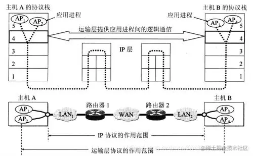 从图中也可以发现,IP协议和运输层协议的区别以及作用范围。更具体地理解可以是,