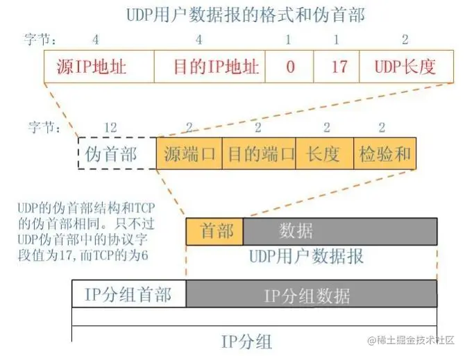 如上图(来源:百度百科),直观地体现UDP数据报的格式以及与IP数据报的关系。