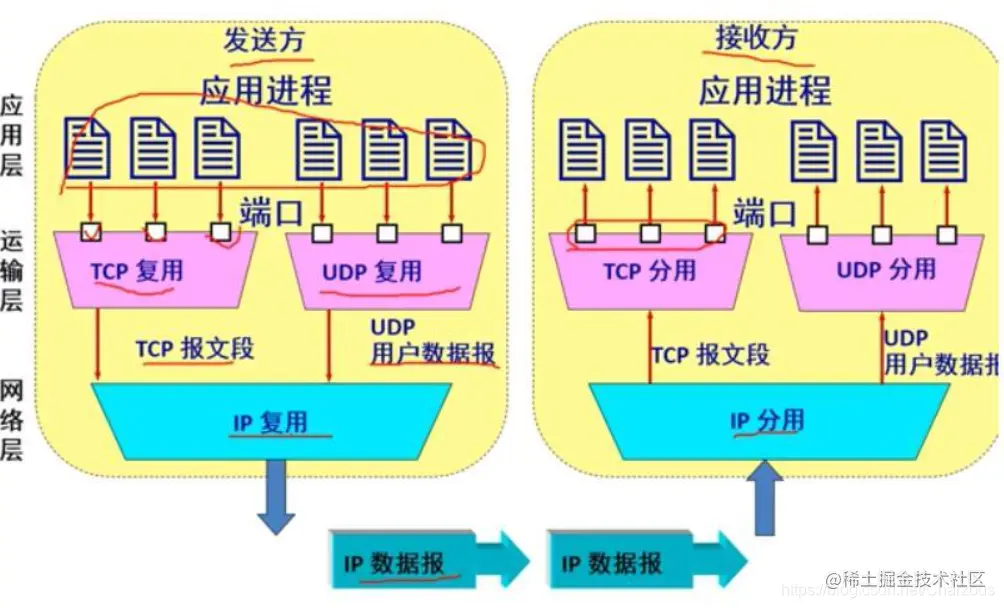 运输层有两个重要的功能:复用和分用。在最开篇TCP/IP体系结构我有记录到这一概念。
