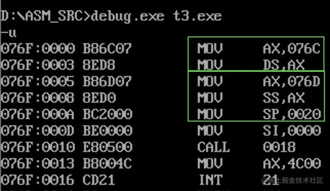 两个绿框内的指令,就是用来设置数据段寄存器 ds、栈段寄存器 ss 和 栈顶寄存器 sp。