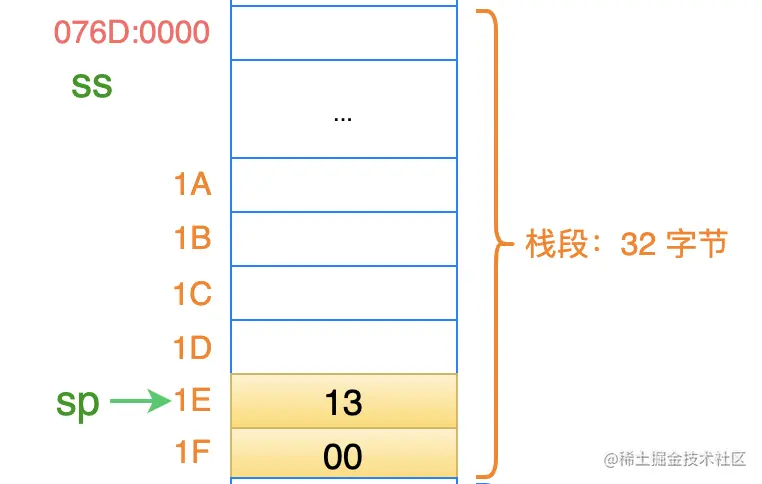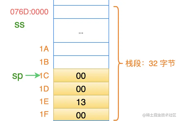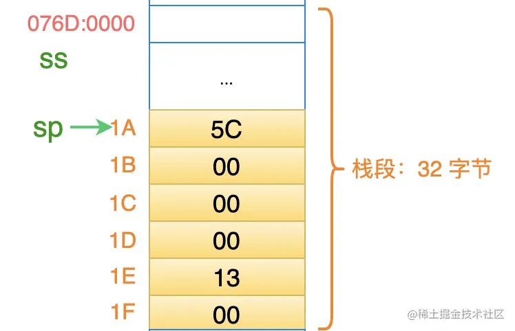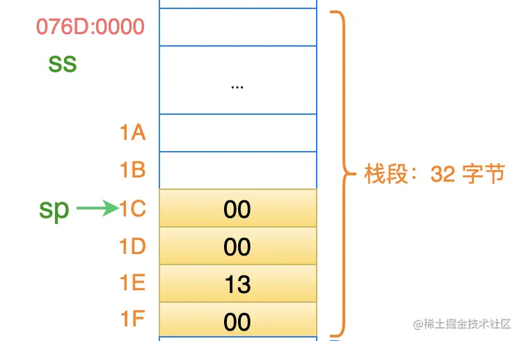 此时,栈顶寄存器 sp 的值为 0020,即:栈的最高地址的下一个位置(为什么是这个位置?上一篇文章有说明)。