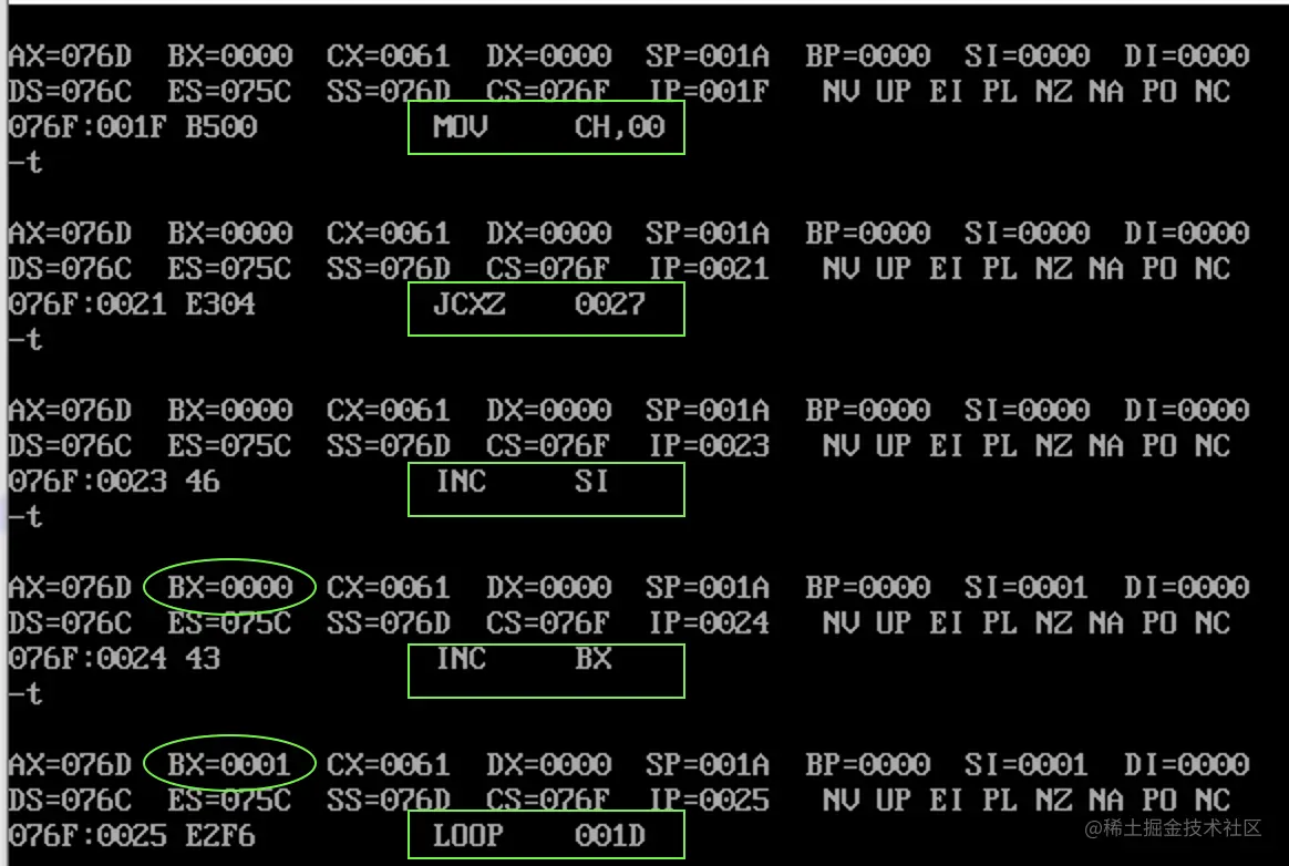 此刻,寄存器 bx 中就存放着字符串的长度:0005: