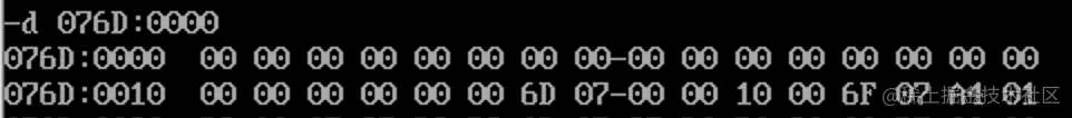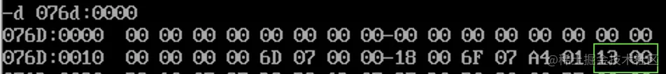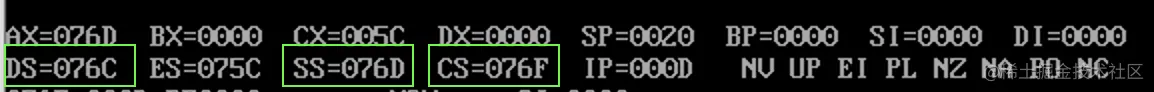 只有 cs:ip 寄存器的值是有意义的,此时它们为 076F:0000,指向第一条代码处。