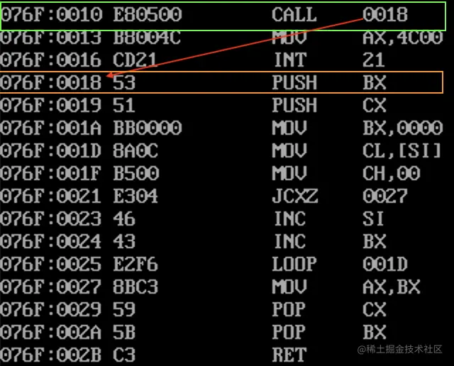 0018 指的是指令寄存器 ip 的值,加上代码段寄存器 cs,就是:076F:0018,这个位置处存储的就是子程序的第一条指令:push bx。