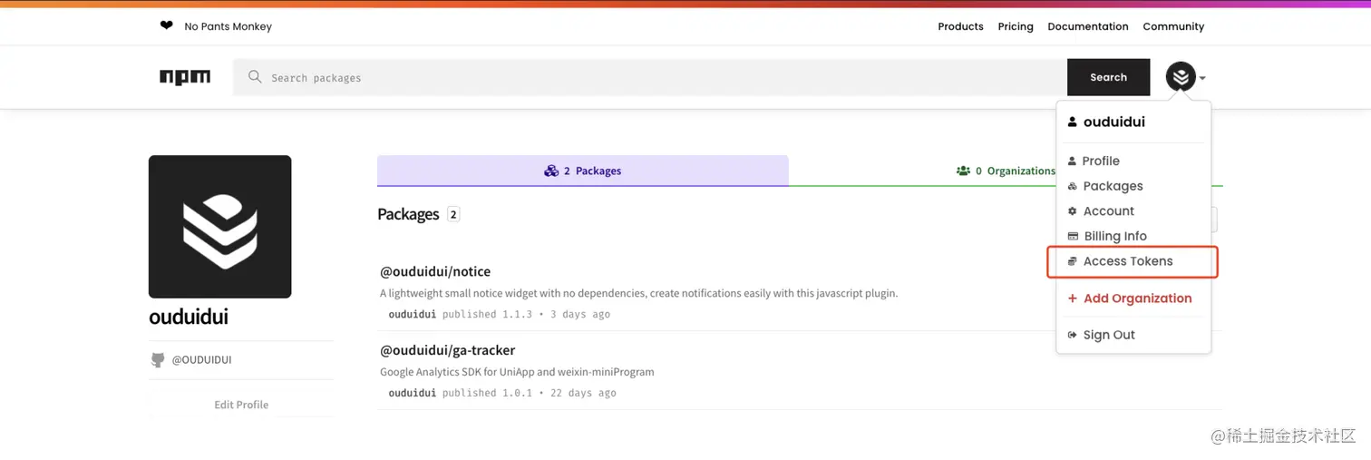 来到npmjs下,登录你的账号,然后点击Access Tokens。