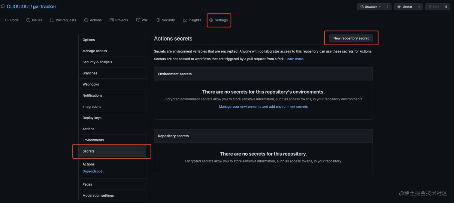 然后来到你的Github,选择你的项目,点击Settings,然后选择Secrets,点击New repository secret。
