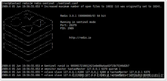 - 哨兵已经启动,它的id为9059917216012421e8e89a4aa02f15b75346d2b7