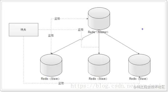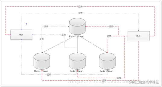 多个哨兵,不仅同时监控主从数据库,而且哨兵之间互为监控。