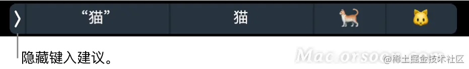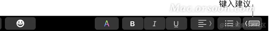 在 Mac 上键入文本时,触控栏能够显示您接下来可能想要使用的字词或短语(称为键入建议),以帮助您节省时间。