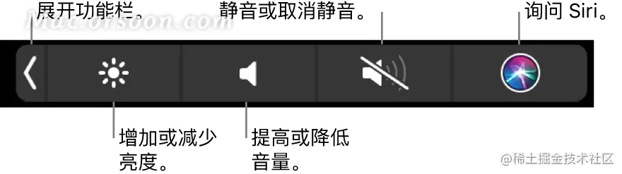 触控栏右端的功能栏可让您询问 Siri 或轻松调整常用设置,只需轻点按钮或在按钮上快速左右轻扫来调整亮度和音量等设置。您还可以展开功能栏以访问更多按钮。