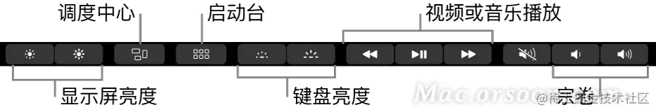 很多 macOS 键盘快捷键都使用功能键(F1 到 F12),例如按下 F11 键显示桌面。在配备触控栏的 Mac 上,功能键显示在触控栏中。