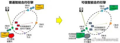 可信智能合约引擎确保合约安全执行:传统的区块链节点,智能合约运行在 REE 侧,安全级别低,合约逻辑可能会被恶意篡改,导致状态数据的变更不可信。另外 REE 侧对数据加密,缺乏根秘钥保护,也不够安全。而华为链利用可行执行环境承担智能合约运行,安全级别高,结合远程证明,防止合约逻辑被恶意篡改,确保交易结果可信。数据保护根秘钥在 TEE 内保存,防止数据被窃取并破解。