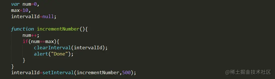 但是通常情况下,很少真正使用间歇调用,因为后一个间歇调用可能在前一个间歇调用结束之前调用。因此,我们通常会使用超时调用来模拟间歇调用
