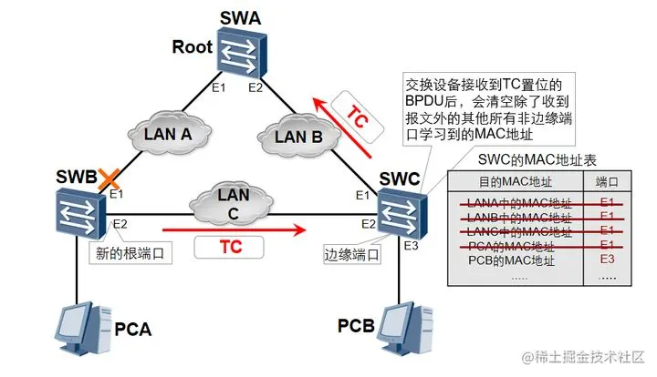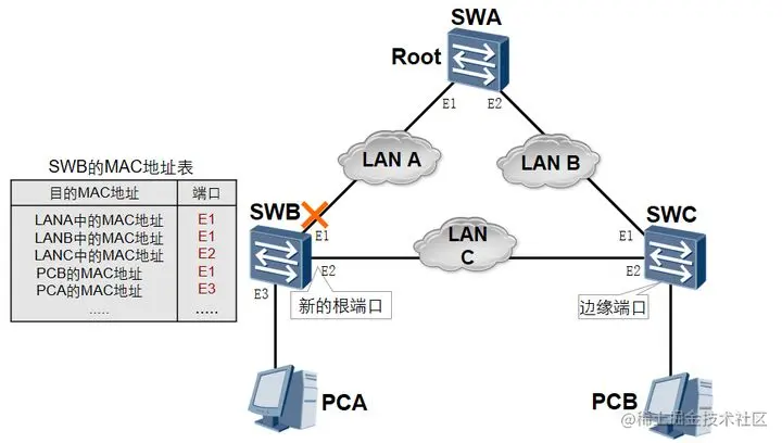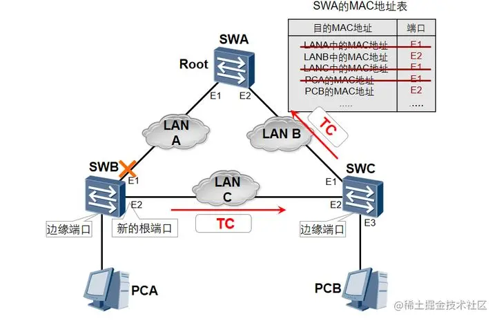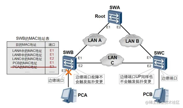如图所示,在稳定情况下,SWC的MAC地址表中对应PCA的MAC地址的端口是E1。如果SWB的E1端口发生了故障,而SWC的MAC地址表中与PCA的MAC地址对应的端口仍然是E1,则会导致数据转发丢失的问题。