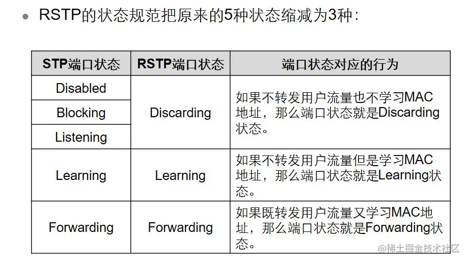 根据STP的不足,RSTP新增加了两种端口角色,并且把端口属性充分地按照状态和角色解耦,使得可以更加精确地描述端口,从而使得协议状态更加简便,同时也加快了拓扑收敛。通过端口角色的增补,简化了生成树协议的理解及部署。