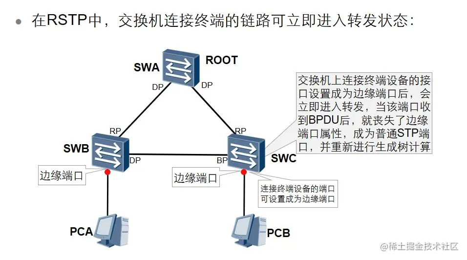 在RSTP中,交换机连接终端的链路可立即进入转发状态: