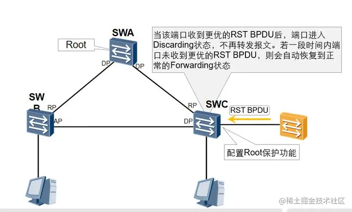 实现原理:一旦启用Root保护功能的指定端口收到优先级更高的RST BPDU时,端口状态将进入Discarding状态,不再转发报文。在经过一段时间,如果端口一直没有再收到优先级较高的RST BPDU,端口会自动恢复到正常的Forwarding状态。
