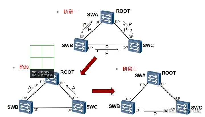 阶段二:交换机SWA收到SWB和SWC的P消息会置之不理,因为他的桥优先级最高。交换机SWB和SWC收到SWA的P消息后,由于认同SWA是最优的根桥,会根据P/A协商流程回复A消息,并把发送端口变成RP端口,同时接口处在Forwarding状态。