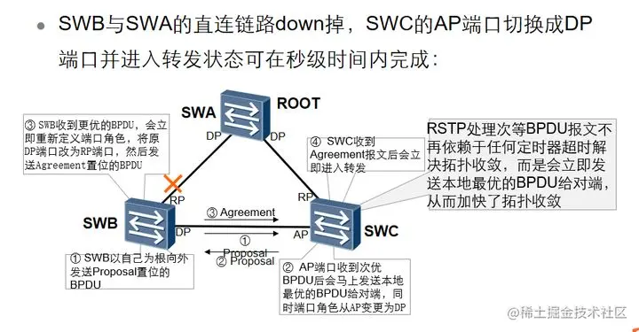 SWB与SWA的直连链路down掉,SWC的AP端口切换成DP端口并进入转发状态可在秒级时间内完成: