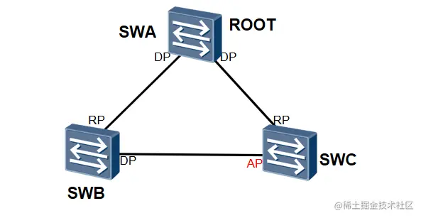 以上状态在等待2个Forward Delay时间后,SWB端口为DP端口,处在Forwarding状态, SWC端口为AP端口,处在Discarding状态。