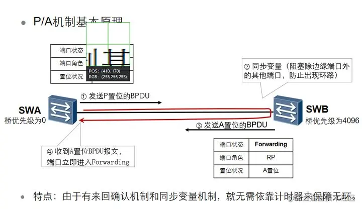 P/A机制要求两台交换设备之间链路必须是点对点的全双工模式。一旦P/A协商不成功,指定端口的选择就需要等待两个Forward Delay,协商过程与STP一样。