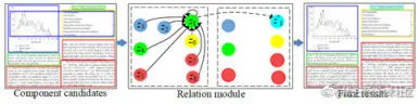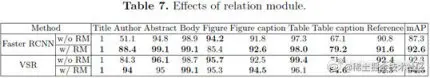在得到 FM 后,可以通过 RPN 网络很容易得到 ROI(Regionof Interest)作为布局部件候选集。本文在实验阶段选择的是 Mask RCNN,同时设置 7 个 anchor 比例(0.02, 0.05, 0.1, 0.2, 0.5, 1.0, 2.0)(0.02,0.05,0.1,0.2,0.5,1.0,2.0)得到部件候选集。如图 3 所示,根据各部件候选之间的关系,可以有如下作用:(1)利用空间位置关系,调整文本框坐标;(2)根据部件间的共现关系(比如表格和表格标题一般会同时出现)修正预测标签;(3)各 component 间不重叠的特性移除多余框。VSR 中关系学习模块对各部件候选间的关系进行建模,并最终得到版面分析的结果。