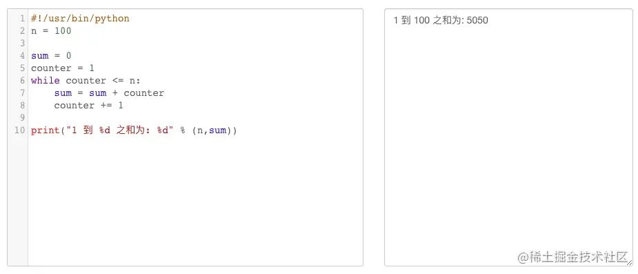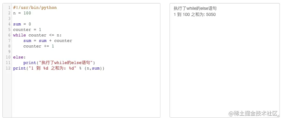 - while 循环使用 else 语句 如果 while 后面的条件语句为 false 时,则执行 else 的语句块。
