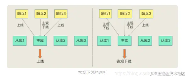 只有大多数的哨兵实例,都判断主库已经“主观下线”了,主库才会被标记为“客观下线”,这个叫法也是表明主库下线成为一个客观事实了。这个判断原则就是:少数服从多数。同时,这会进一步触发哨兵开始主从切换流程。