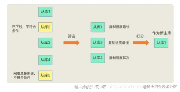 再按照一定的规则,给剩下的从库逐个打分,将得分最高的从库选为新主库