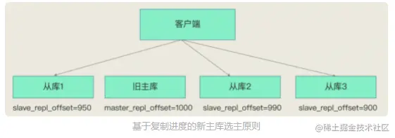 就像下图所示,旧主库的 master_repl_offset 是 1000,从库 1、2 和 3 的 slave_repl_offset 分别是 950、990 和 900,那么,从库 2 就应该被选为新主库