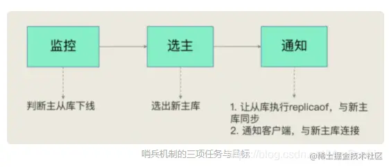 哨兵集群判断出主库“主观下线”后,会选出一个“哨兵领导者”,之后整个过程由它来完成主从切换。