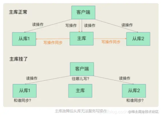 从库发生故障了,客户端可以继续向主库或其他从库发送请求,进行相关的操作,但是如果主库发生故障了,那就直接会影响到从库的同步,因为从库没有相应的主库可以进行数据复制操作了。而且,如果客户端发送的都是读操作请求,那还可以由从库继续提供服务,这在纯读的业务场景下还能被接受。但是,一旦有写操作请求了,按照主从库模式下的读写分离要求,需要由主库来完成写操作。