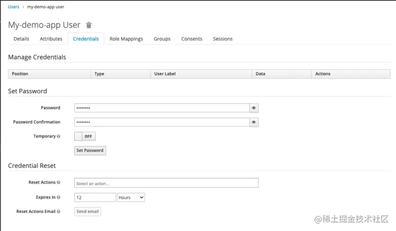 - 最后要做的是,在能够用该用户登录之前,先到凭证 处填写密码和密码确认字段,并在临时 字段旁边 选择关闭(这样我们就不会在第一次登录时被迫更新密码)。然后点击设置密码按钮。