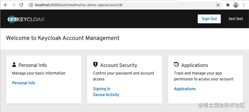 在检查了一切都正确之后,点击保存按钮,你会看到一个 登录 按钮。点击它,你将被重新引导到 Keycloak登录页面。使用用户证书(用户名:my-demo-app-user和在步骤2中创建的密码),你将被重定向到应用程序和你的用户账户信息,这就是全部了
